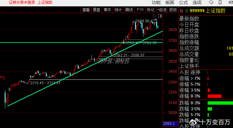 这样一来,周四的那个放量阴线就有见顶的味道了,3899.96,离4000点只差0.04,无形之手的控盘力度太强了。如果真的见顶,那就是一个M头了。