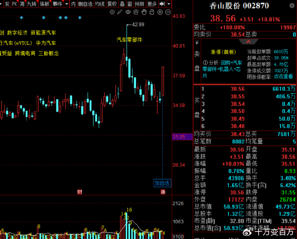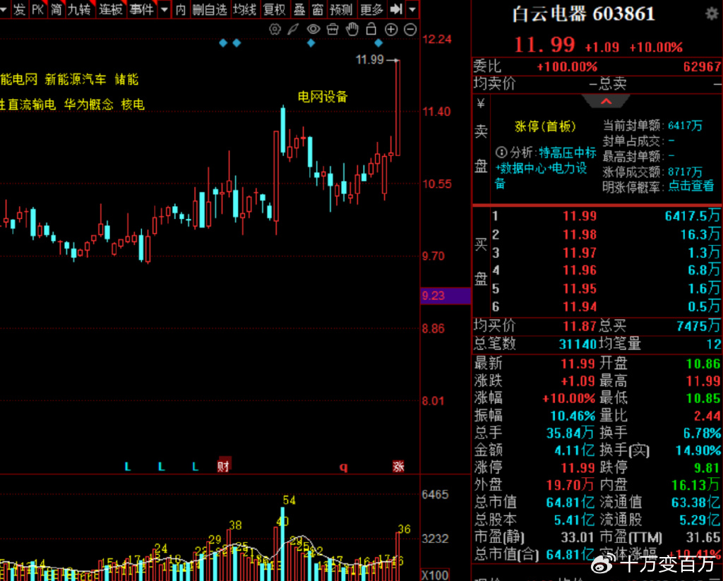 可惜白云电器排队到收盘都没有成交。这个股票既有机器人概念,又有核电和智能电网概念,明天大概率是要连板了,感觉错过一个亿。