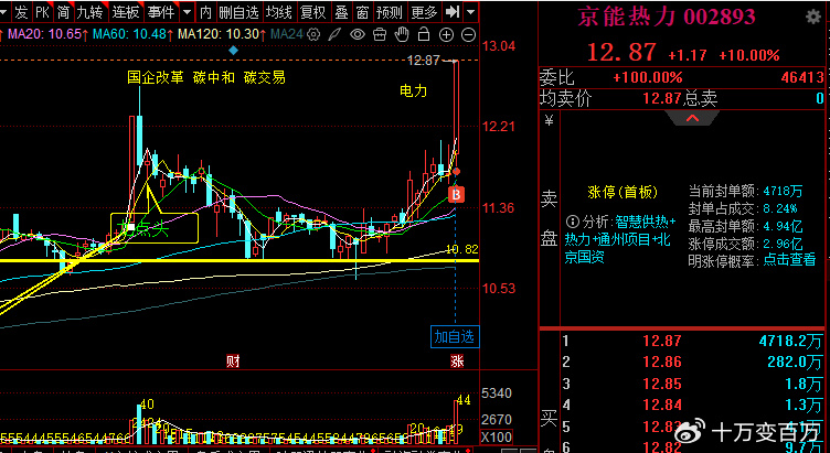 京能热力的涨停符合无脑入模式,立即卖出一半的苏宁环球打板它!中午两次炸板给了成交机会。