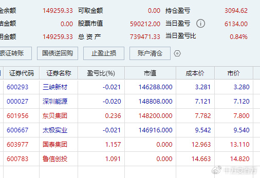 低吸的两个票:鲁信创投和国泰集团,都是小赚1个点走人了,换了两个低吸票:东贝集团和深圳能源。