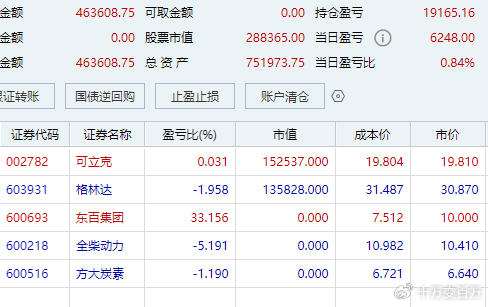 [color=rgba(0, 0, 0, 0.9)]今天东百集团设置了9.48元的保利价,想不到开盘瞬间打到9.35元触发了条件单成交了。本来可以从容在涨停价上走的,我太保守了,少赚5%,28%收益吃进肚子,知足了。最后一个铜板让别人去赚吧!