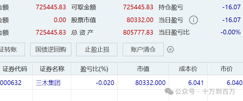 看到老人气股三木集团一路下跌接近20均线,跌停板上有一亿多的撬板资金进去,我也在跌停上摸一把鱼,测试一下20均线,仓位不敢太重,就一成仓位。