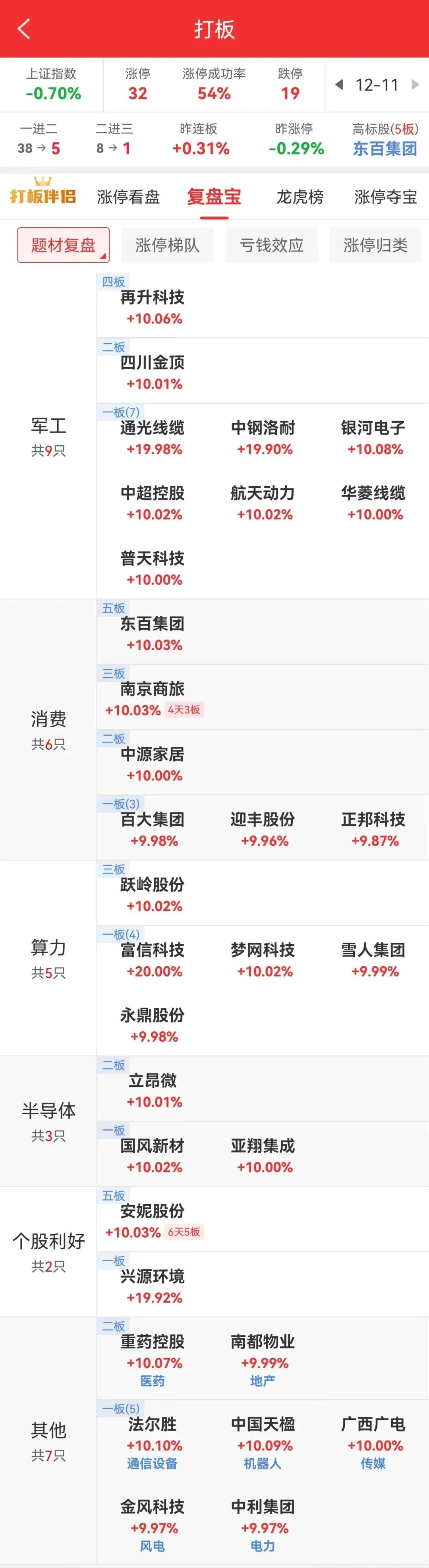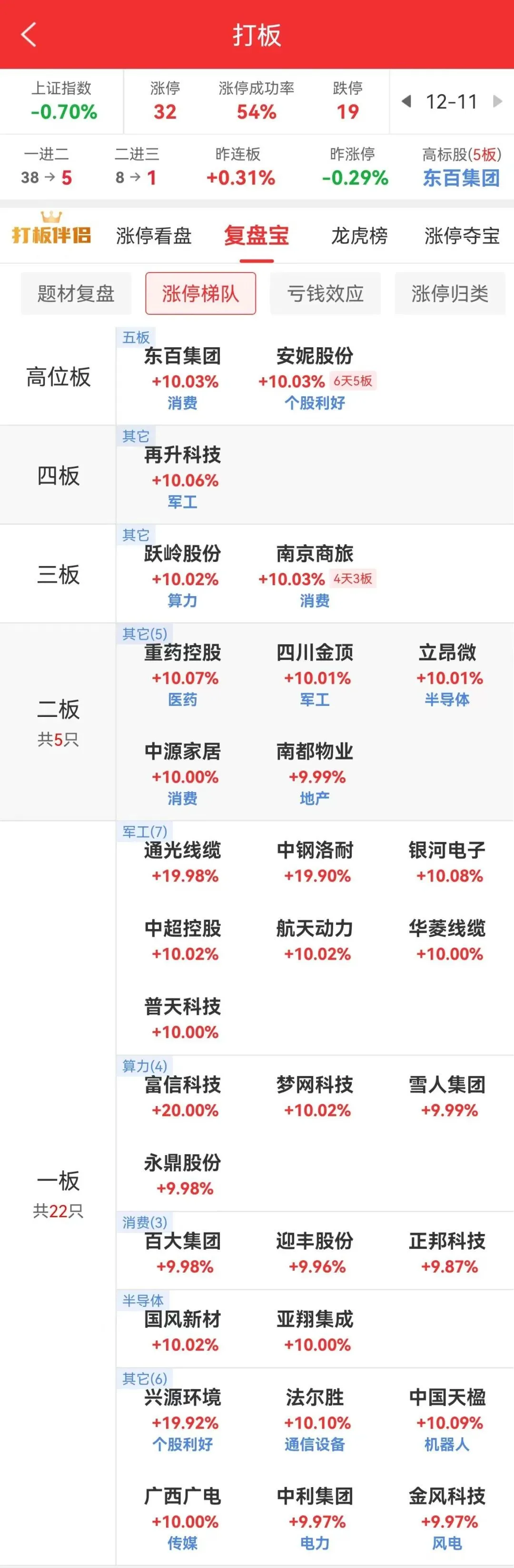 短线情绪弱势,连板东百集团五连板,但有龙洲股份大幅回落,安记食品、舒华体育等近20家个股跌停。