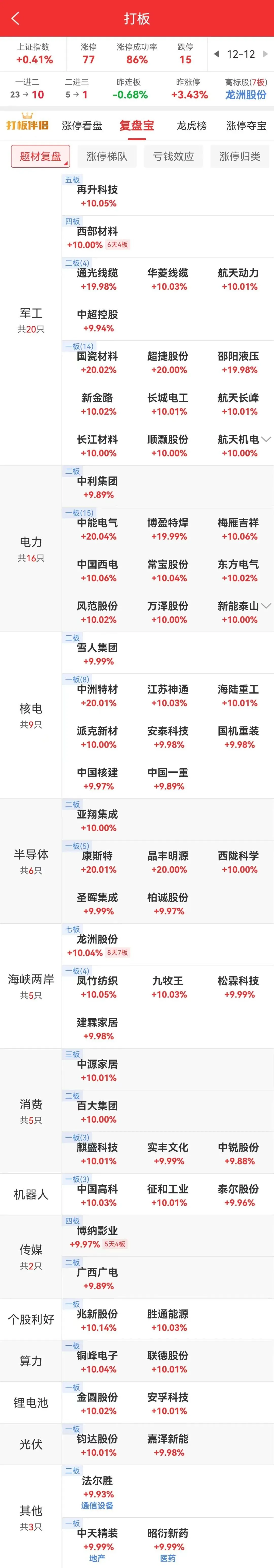 另有核电、芯片、海峡两岸、人工智能硬件等多题材轮动。短线情绪局部修复,高位股顺灏股份、龙洲股份等相继涨停均创趋势新高,东百集团跌停翻红,北交所天力复合二连板,但有永辉超市等超10家个股跌停。