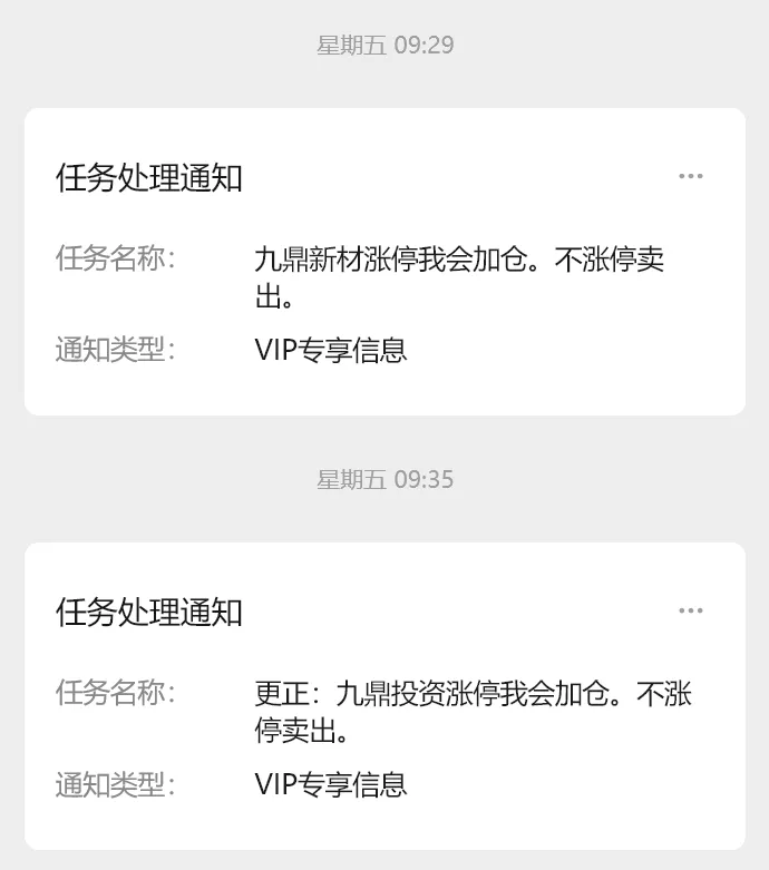 开盘后我闹了个乌龙,把九鼎投资板上加仓的消息,写成了九鼎新材,幸亏及时发现并改正。