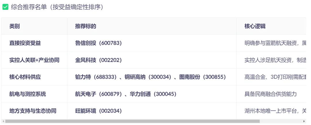 另外就是蓝箭航天上市相关受益个股,部分名单如下: