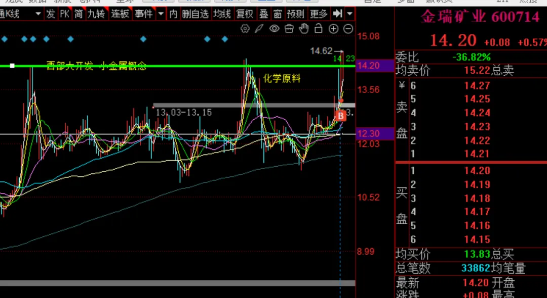 金瑞矿业近期的上涨是受中东紧张局势影响,很多化工和金属品种出现了上涨,它今天能够逆势收红并创了新高,且形态符合三重顶,一旦冲过后市空间可观,所以今天有解套机会我也没走,继续拿着。
