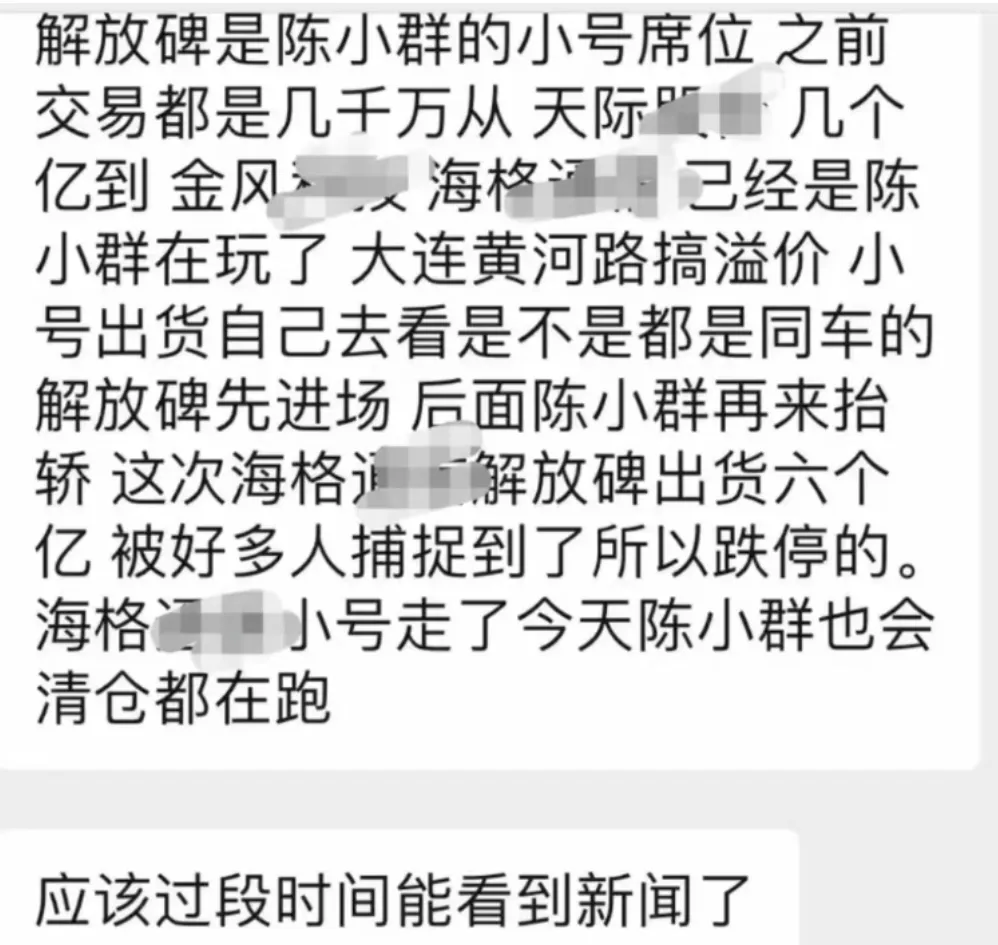 随着股民愤怒值拉满,各种传言满天飞:有人说陈小群被请去喝茶;有人说陈小群涉嫌操纵股价,说解放碑是其小号,小号先建仓天际、金风、海格,然后陈小群的大连黄河路抬轿子。