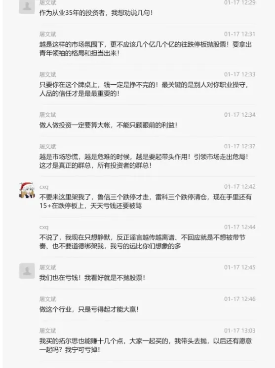 有备注为“屠文斌”的大佬下午说教陈小群的帖子火了。他表示,越是这样的氛围越不应该几个亿个亿的抛售,要拿出顶级游资的格局和担当出来,不能只顾眼前利益,越是危难,越应带领市场走出危局。