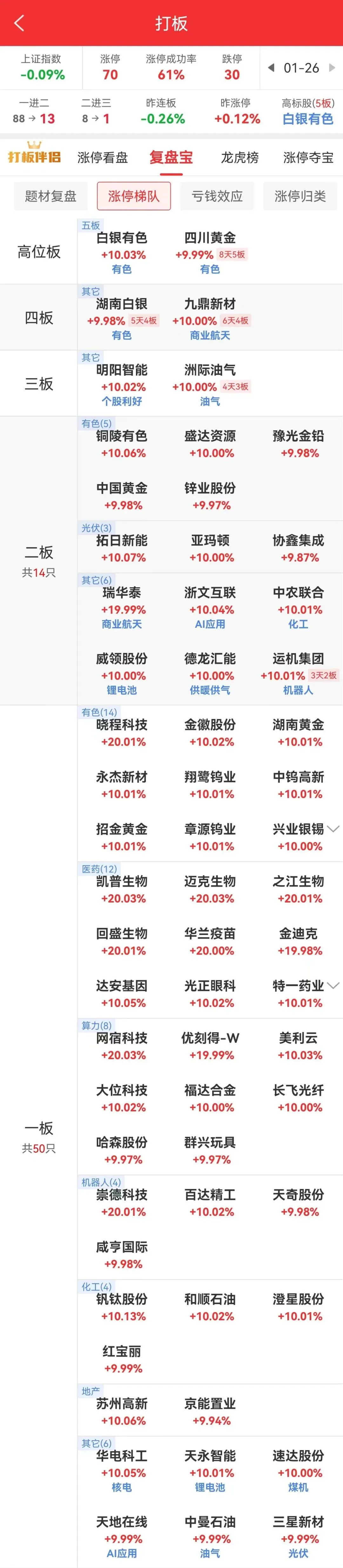 太空光伏冲高回落,拓日新能二连板,钧达股份、双良节能等炸板。午后题材局部回流,商业航天通宇通讯翻红,九鼎新材尾盘涨停,但有权重中国卫星跌停,航天电子等大跌。另有AI应用端浙文互联回封,蓝色光标深水翻红。