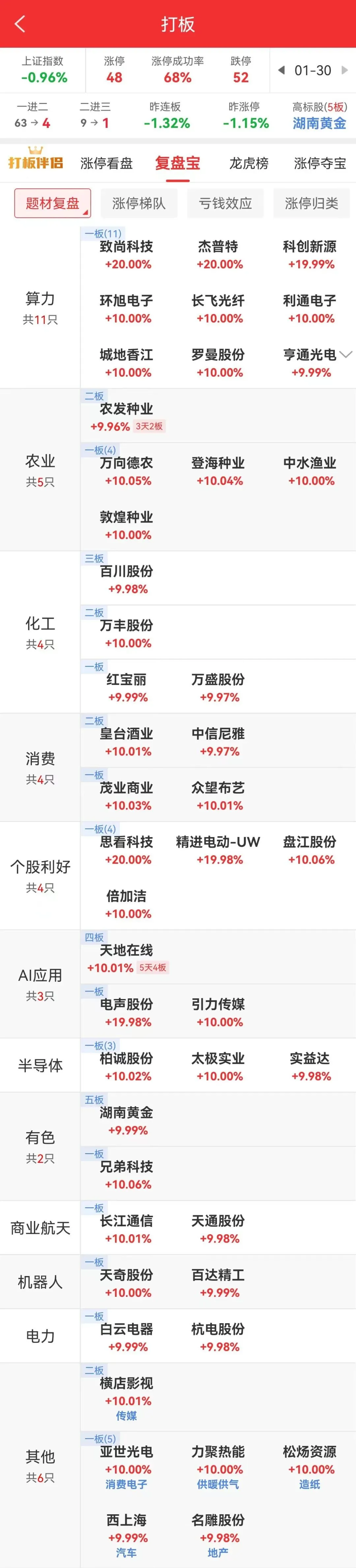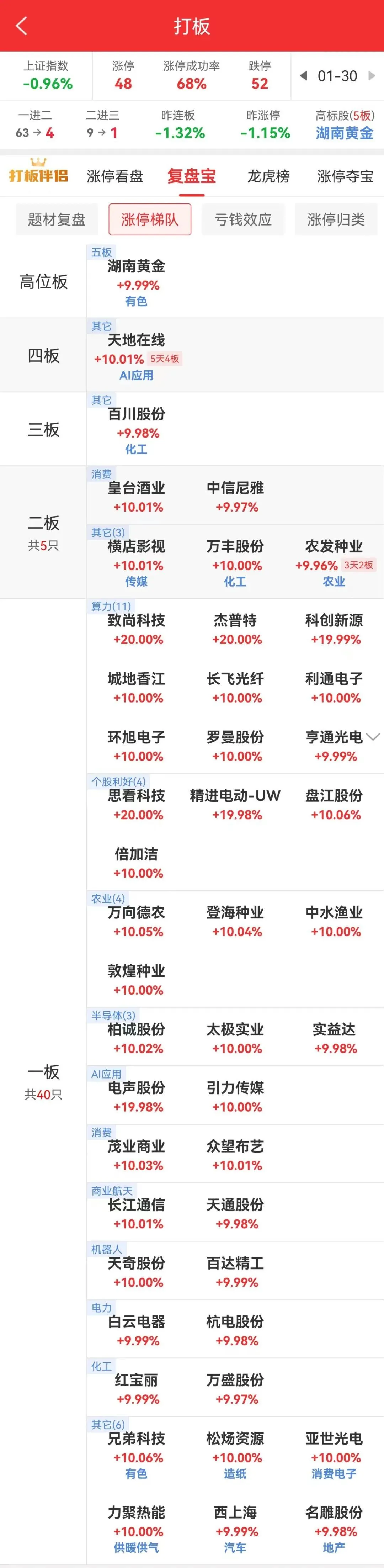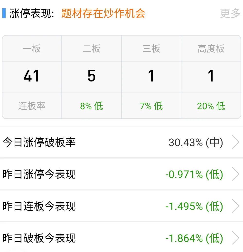 农业板块农发种业回封三天二板。化工板块百川股份三连板,红宝丽午后涨停。另有石油石化、煤炭板块、氢能源等小幅轮动。短线情绪弱势,有色金属高位股四川黄金等多股跌停,20cm晓程科技跌停,负反馈明显。但有天地在线十天六板、百川股份三连板。