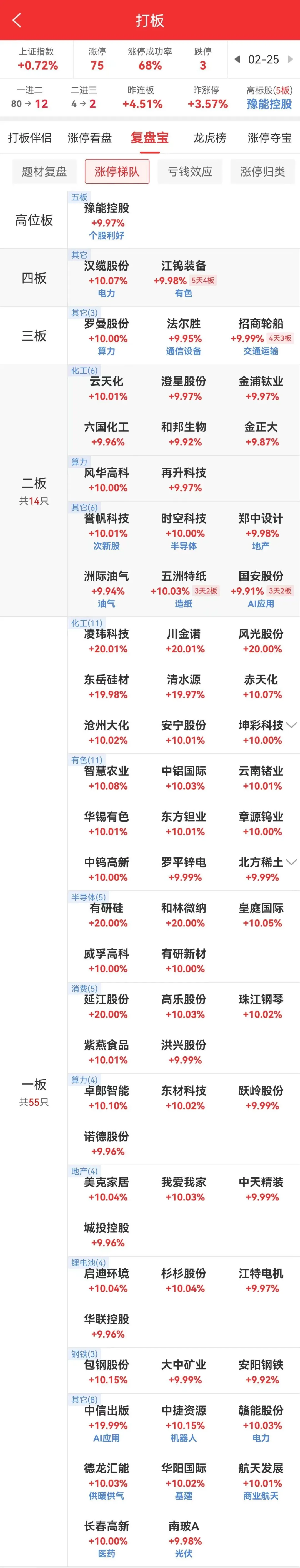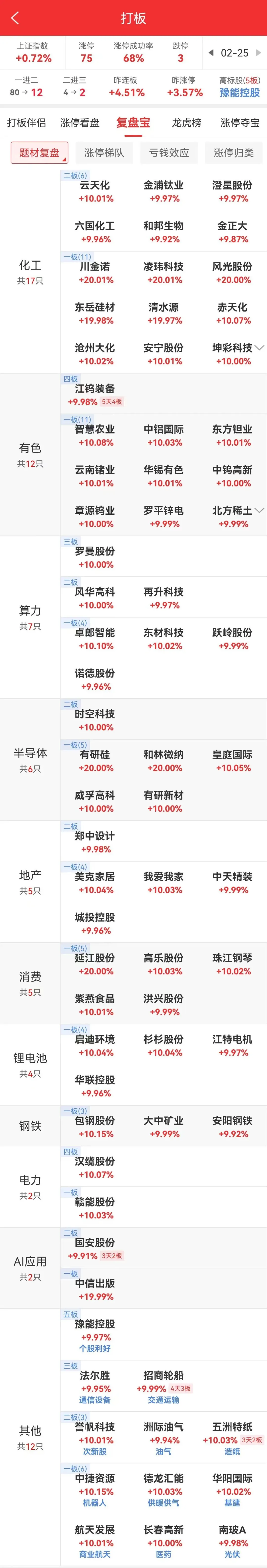 市场局部强势,化工板块延续活跃,其中澄星股份大单一字二连板,金正大五天三板,20cm清水源、东岳硅材等首板,板块近20家个股涨停。此外有色金属江钨装备五天四板,章源钨业、东方钼业五天三板。AI硬件风华高科回封二连板,权重胜宏科技涨近10%。AI应用国安股份六天三板,中信出版20cm涨停。另有磷化锢概念跃岭股份大单一字,航运板块招商轮船四天三板,稀土永磁北方稀土涨停。另有石油石化、商业航天、芯片等多题材轮动。