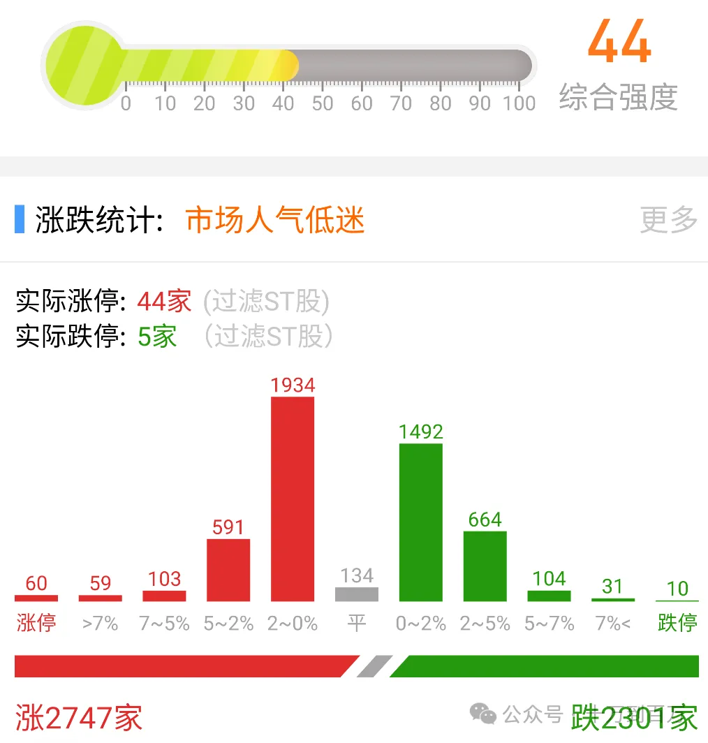 三大指数下探回升,创业板指午后领涨涨超1%,收盘两市总成交不足2.4万亿,相较前一交易日缩量3%,上涨个股超2500家。市场弱势轮动,科技分支局部强势。