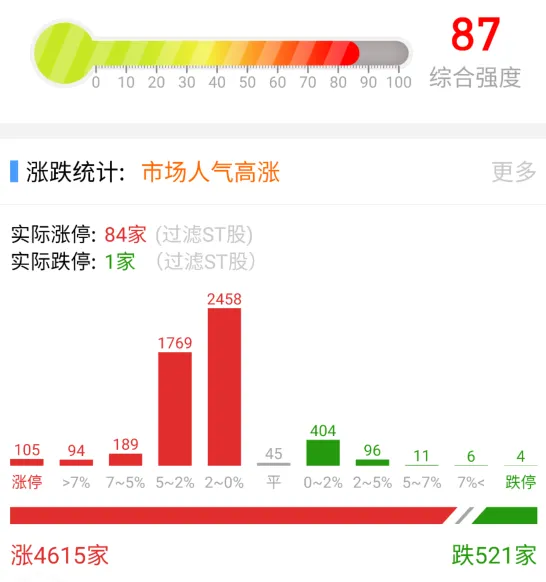 三大指数高开高走,全天强势震荡,收盘两市总成交超2.1万亿,相较前一交易日放量5%,上涨个股超4500家。市场延续修复,题材强势轮动。其中算电协同新能泰山、湖南发展一字,华电辽能八连板,韶能股份六天五板,板块多股涨停。