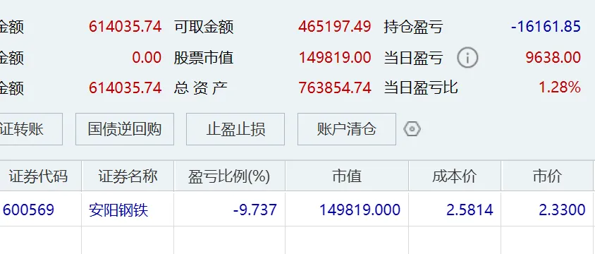 安阳钢铁按计划反弹时出了一半,补仓的部分小赚3个点,加上回血了3个点,有效降低成本,减少亏损。