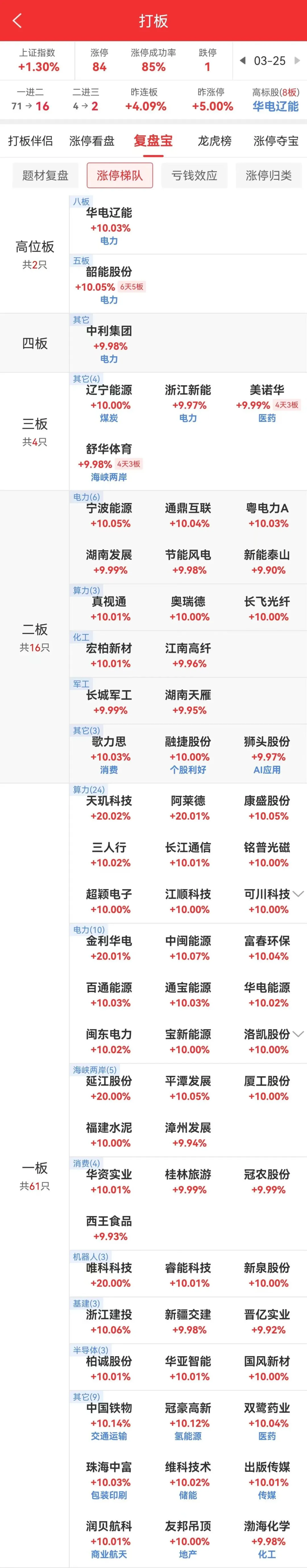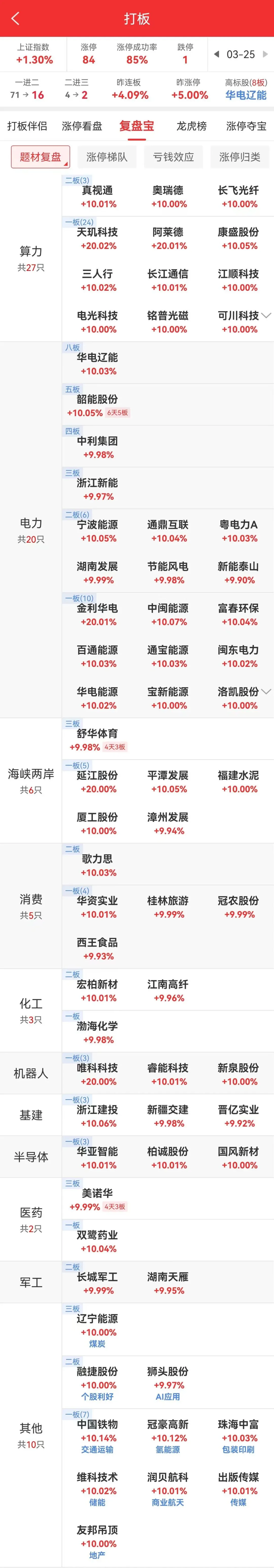 另有体育产业、芯片概念、芯片(存储)、军工板块等轮动。短线情绪整体强势,连板华电辽能八连板,辽宁能源等晋级,美诺华、舒华体育等题材前排涨停创趋势新高,但有高位股豫能控股午后跳水。