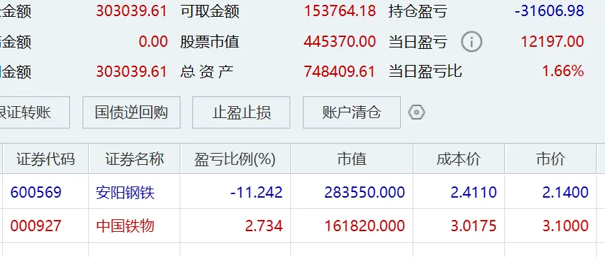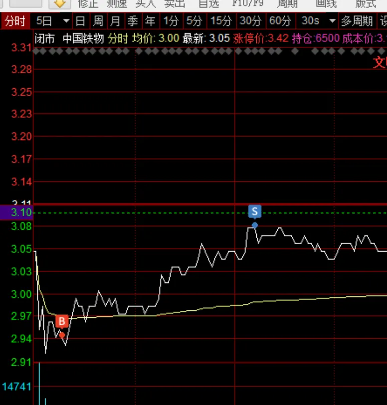低吸的铁物持续下跌,今天开盘后更是大跌6个点,于是我就在2.94元抄了个底,3.08元卖出,做T小赚接近5个点,成功把此股扭亏为盈。